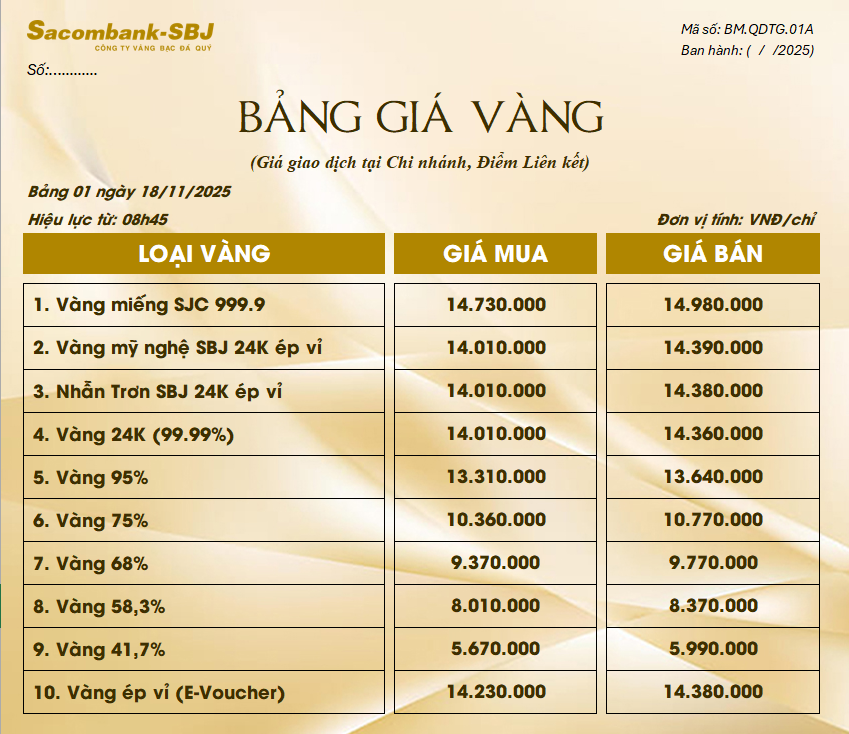 Bảng Tỷ Giá Vàng - Ngày 18/11/2025 - Bảng 1 - Tại Chi nhánh/Điểm liên kết