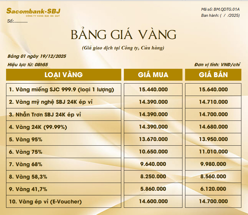 Bảng Tỷ Giá Vàng - Ngày 19/12/2025 - Bảng 1 - Tại CH 278 NKKN TP HCM