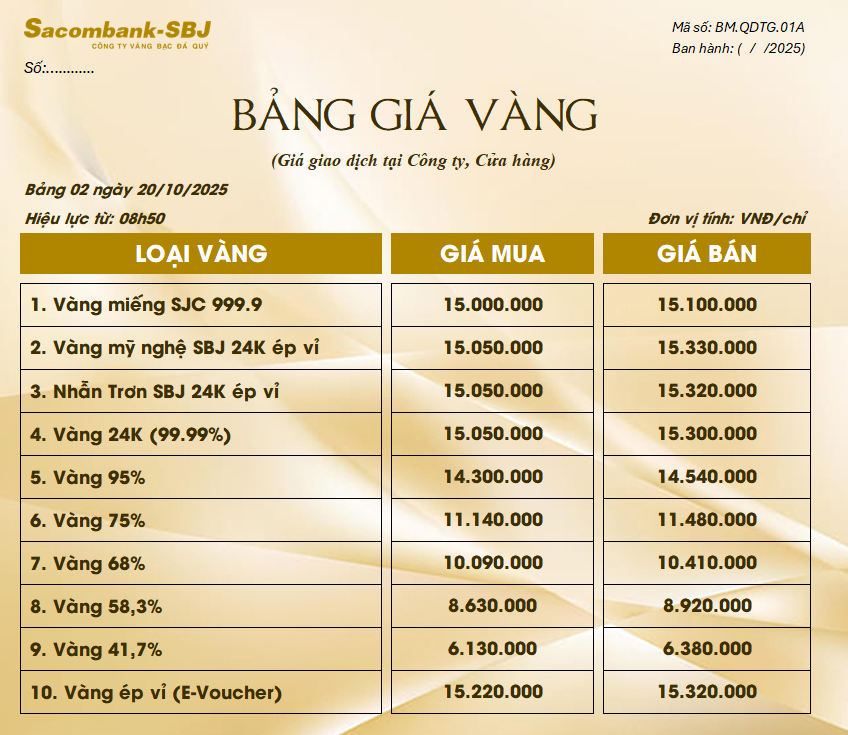 Bảng Tỷ Giá Vàng - Ngày 20/10/2025 - Bảng 2 - Tại CH 278 NKKN TP HCM