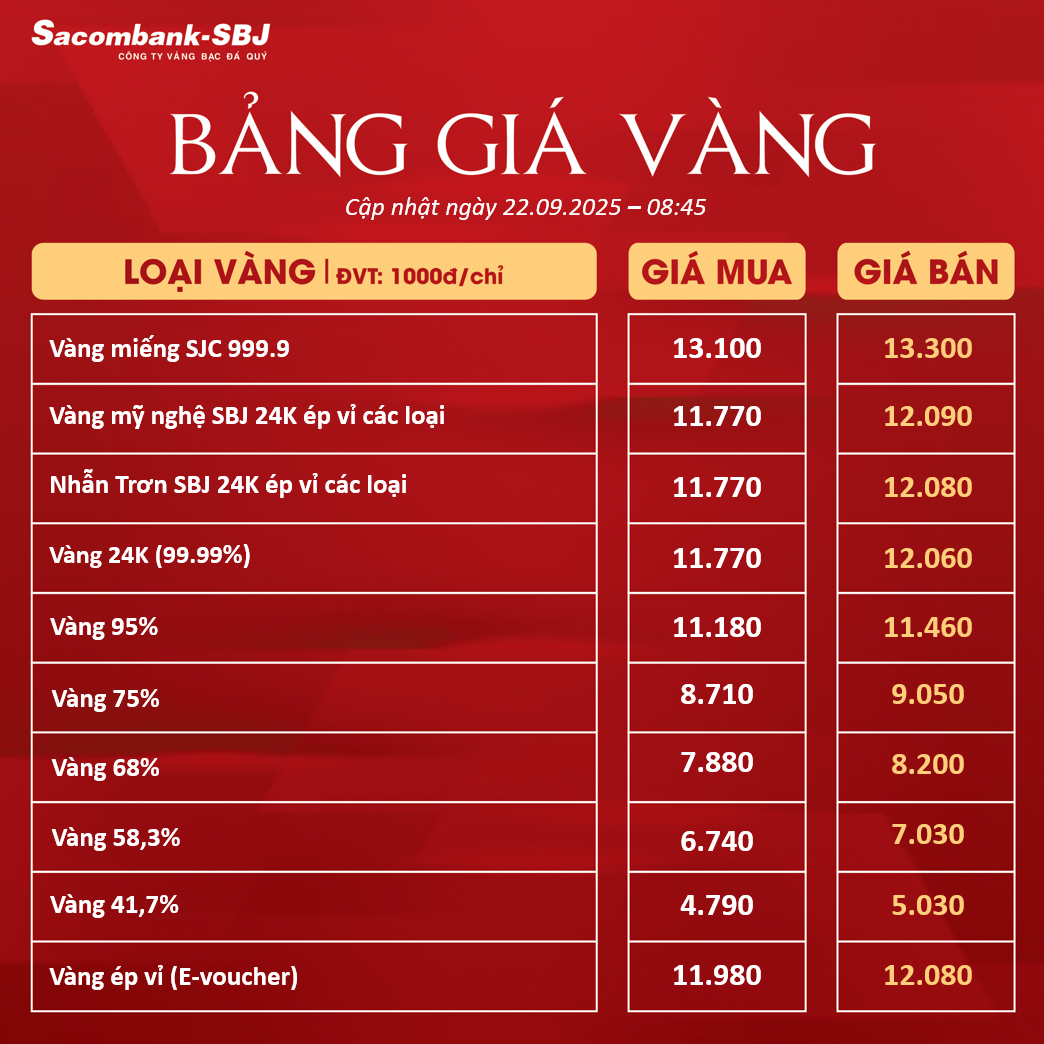Bảng Tỷ Giá Vàng - Ngày 22/09/2025 - Bảng 1