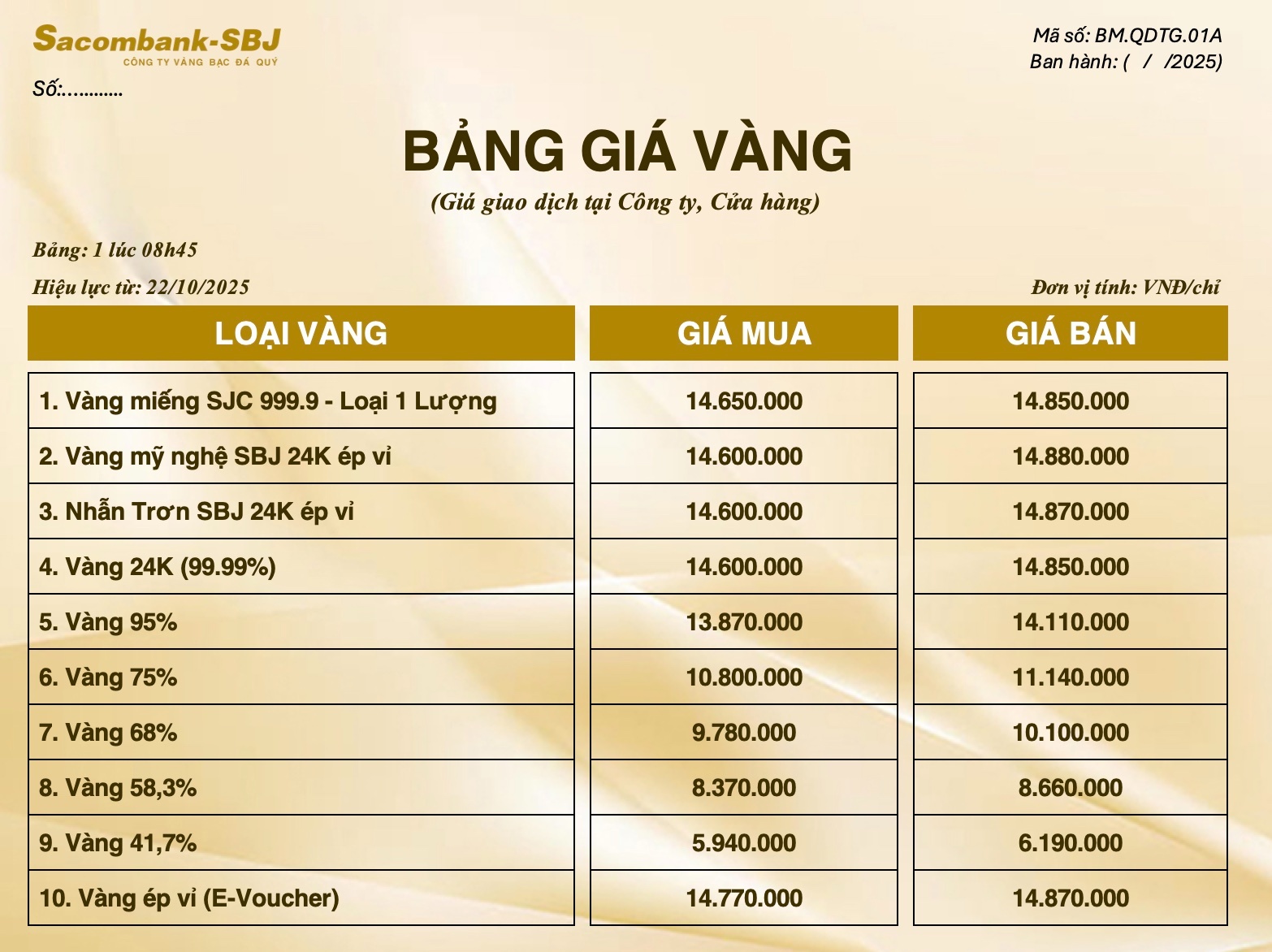 Bảng Tỷ Giá Vàng - Ngày 22/10/2025 - Bảng 1 - Tại CH 278 NKKN TP HCM