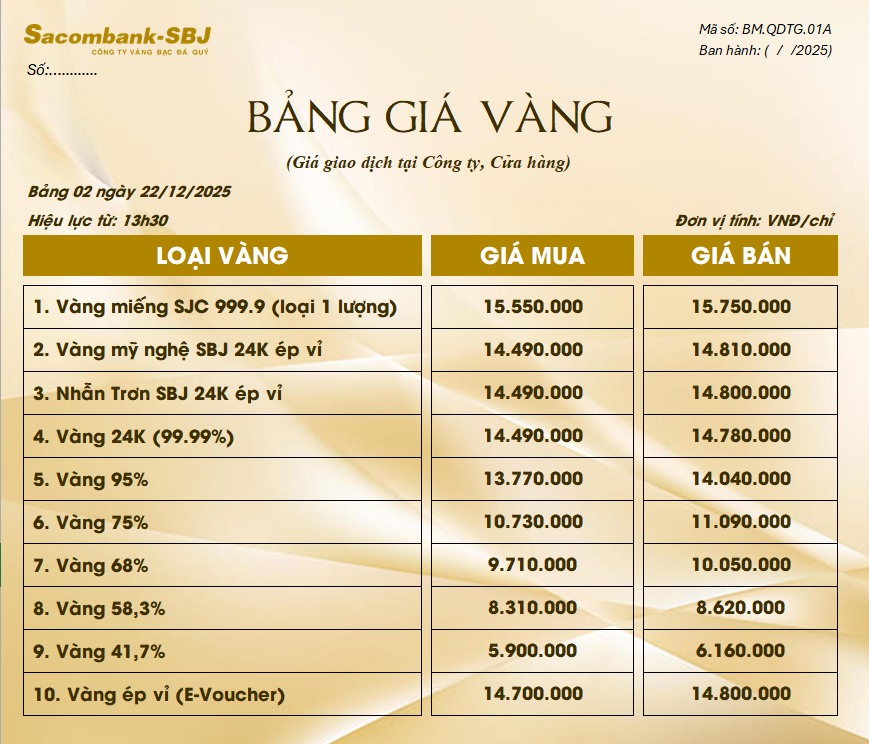 Bảng Tỷ Giá Vàng - Ngày 22/12/2025 - Bảng 2 - Tại CH 278 NKKN TP HCM