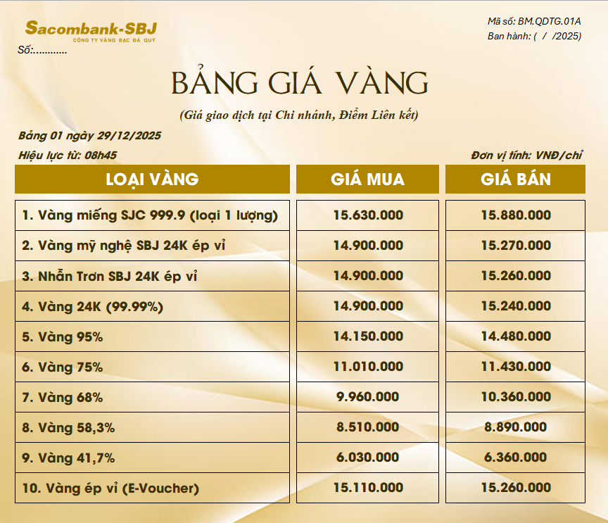 Bảng Tỷ Giá Vàng - Ngày 29/12/2025 - Bảng 1 - Tại Chi nhánh/Điểm liên kết