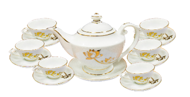Bộ ấm tách trà men sứ trắng vẽ vàng logo Sacombank, bộ 1 ấm 6 ly kèm dĩa